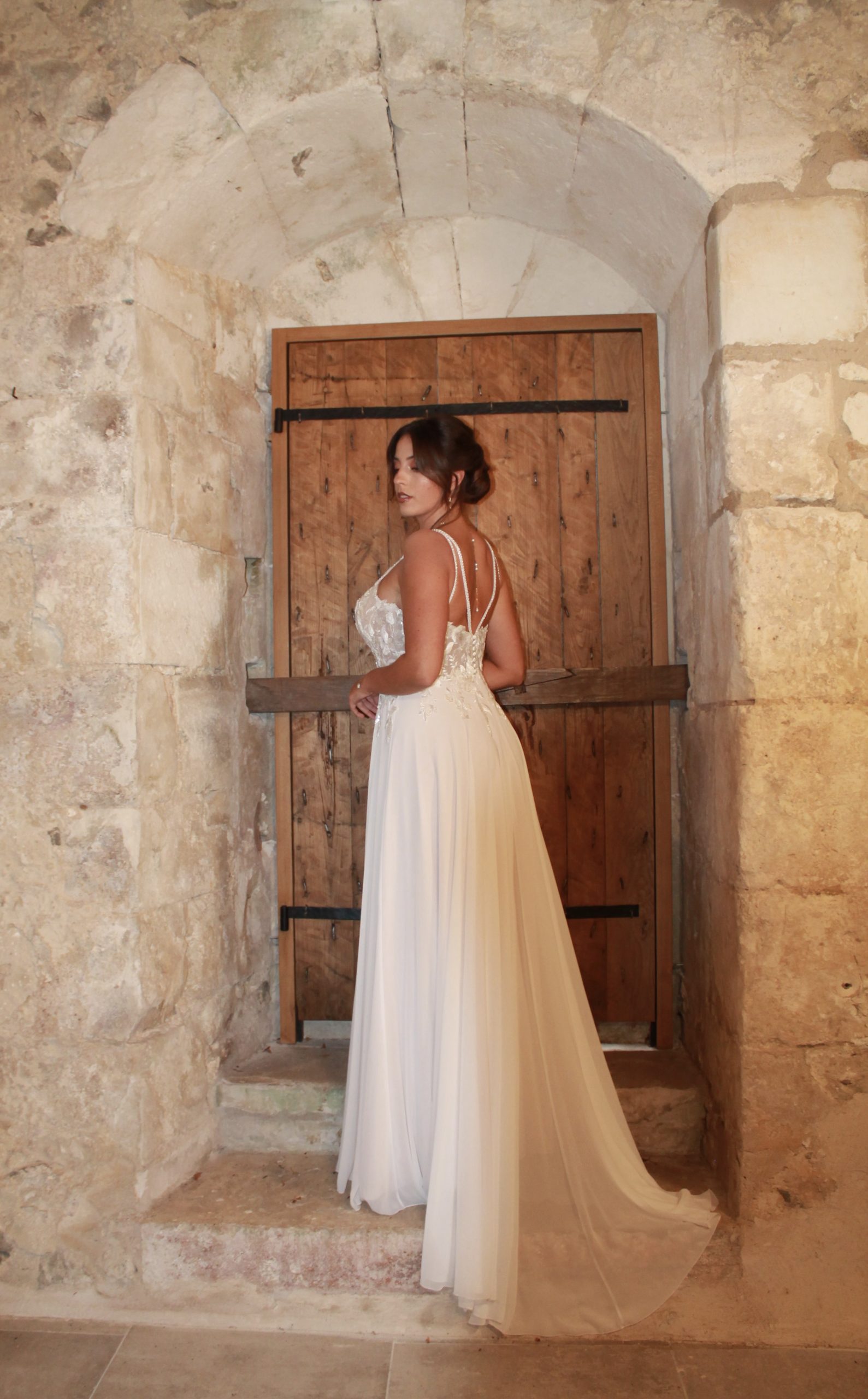Robe de mariée bohème Dax fluide et élégante avec dentelle et dos travaillé. Idéale pour mariage champêtre ou bohème dans les Landes et Pays Basque.