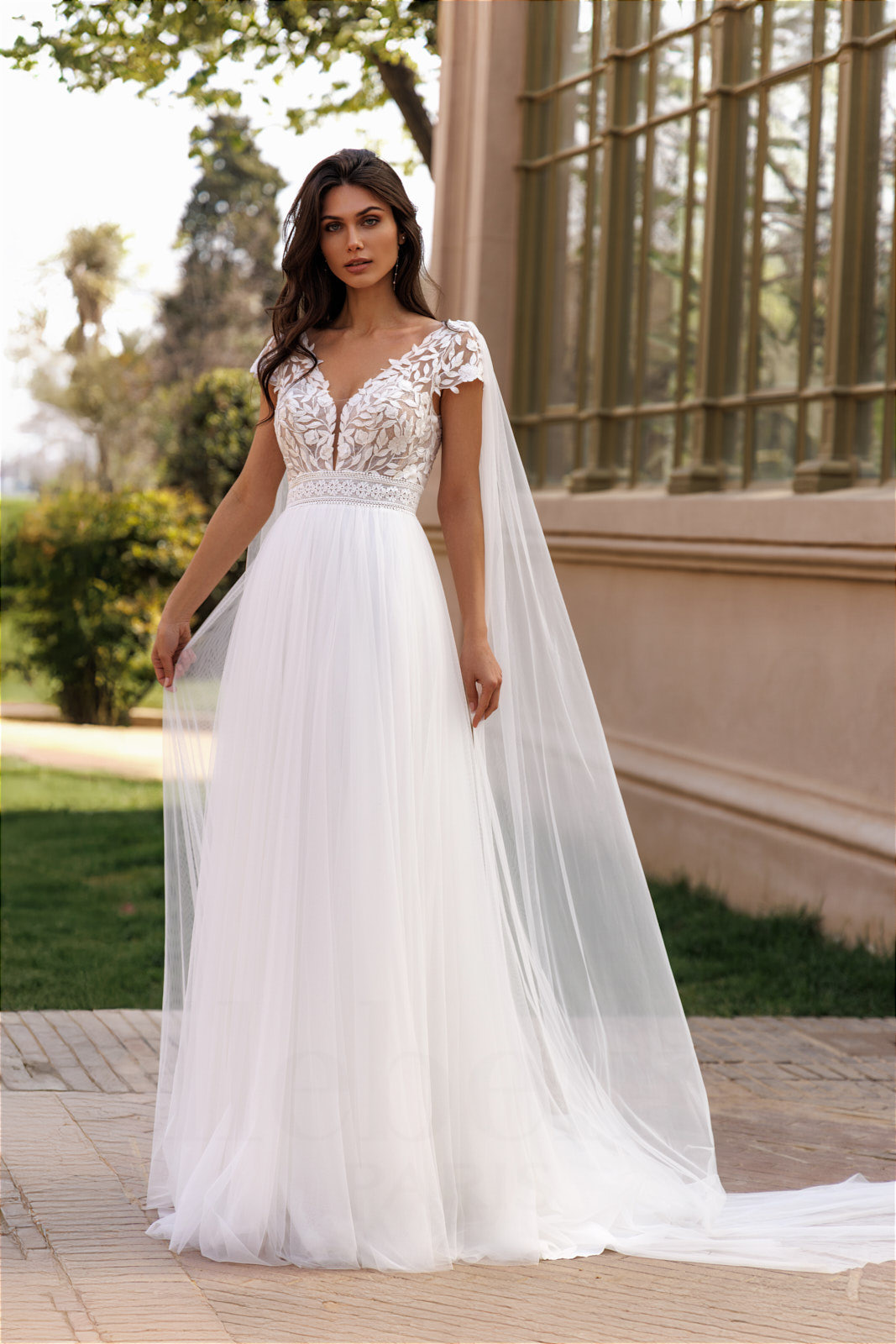 Cette robe de mariée Hera se distingue par son bustier délicatement travaillé en dentelle florale qui met en valeur le décolleté avec élégance. Les motifs brodés apportent une touche naturelle et romantique à l’ensemble de la robe.