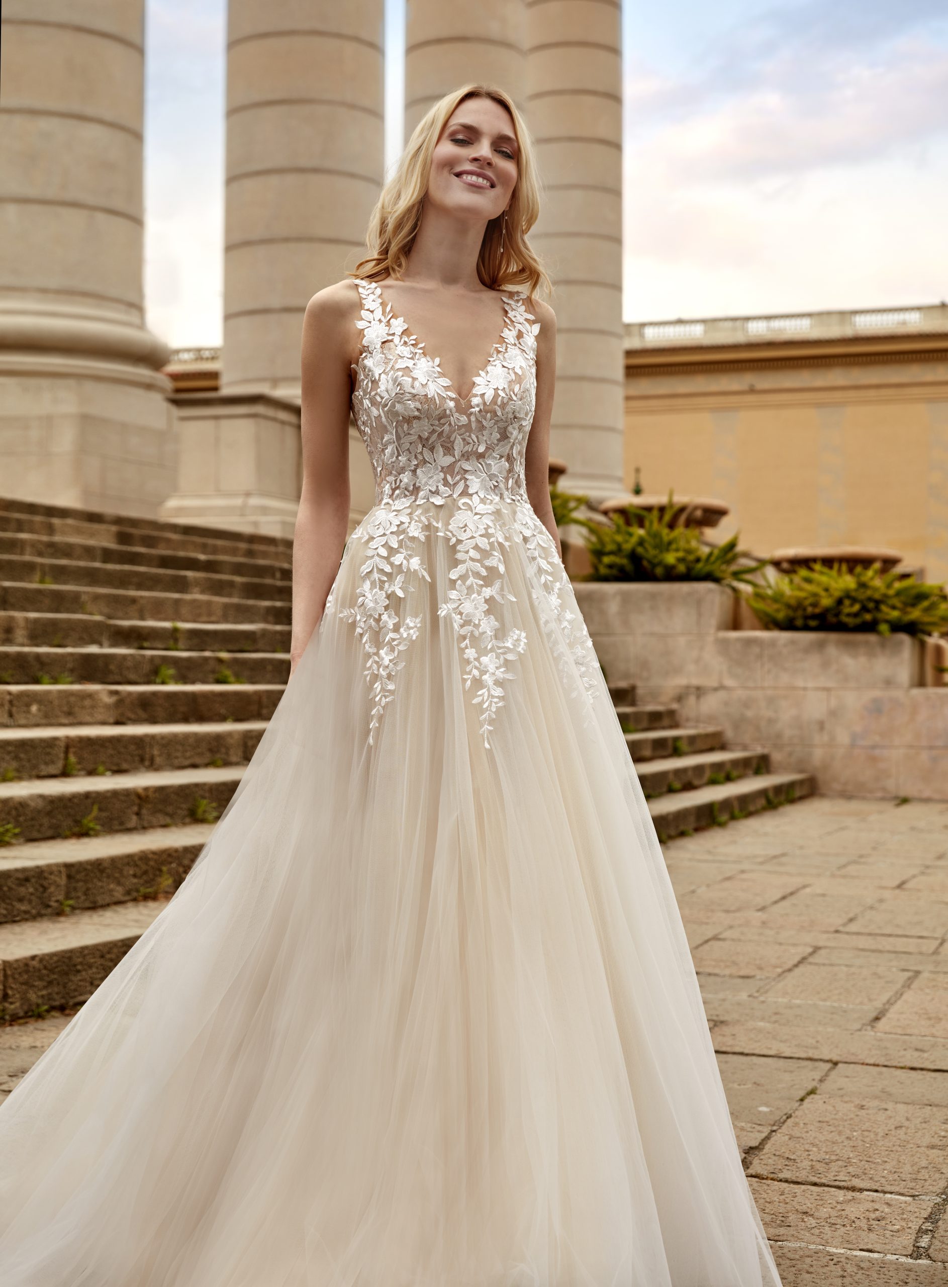 Cette robe de mariée Isadora se distingue par son bustier en dentelle délicatement travaillé qui met en valeur le décolleté avec élégance. Les motifs floraux brodés apportent une dimension romantique et raffinée à l’ensemble de la robe.