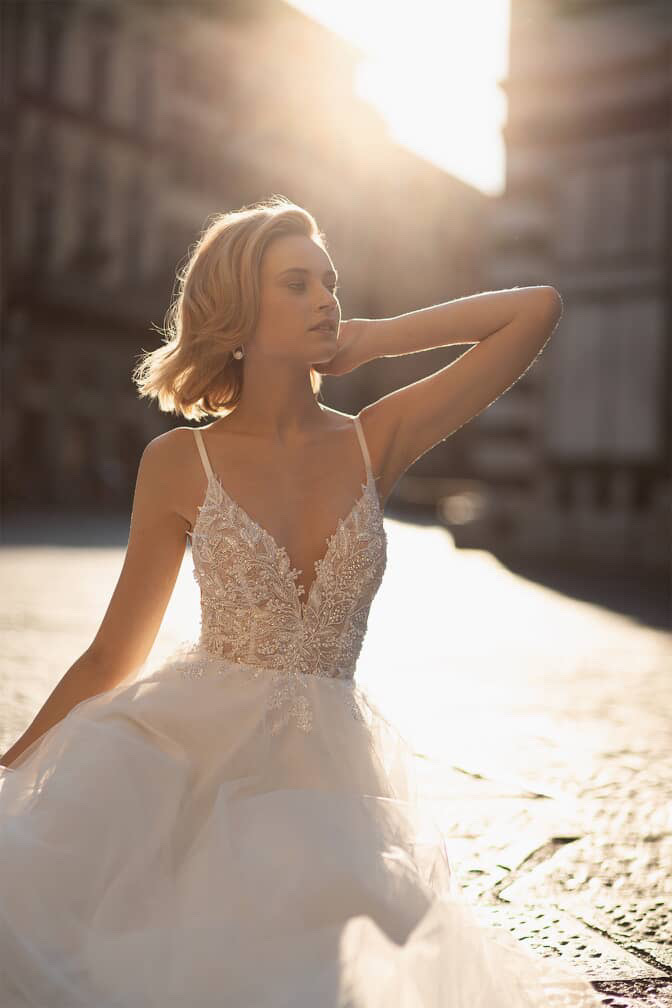 La robe de mariée princesse Dax THALÈS incarne la douceur et l’élégance avec une touche moderne. Son bustier délicatement brodé met en valeur le décolleté avec finesse, tandis que ses fines bretelles apportent légèreté et féminité.