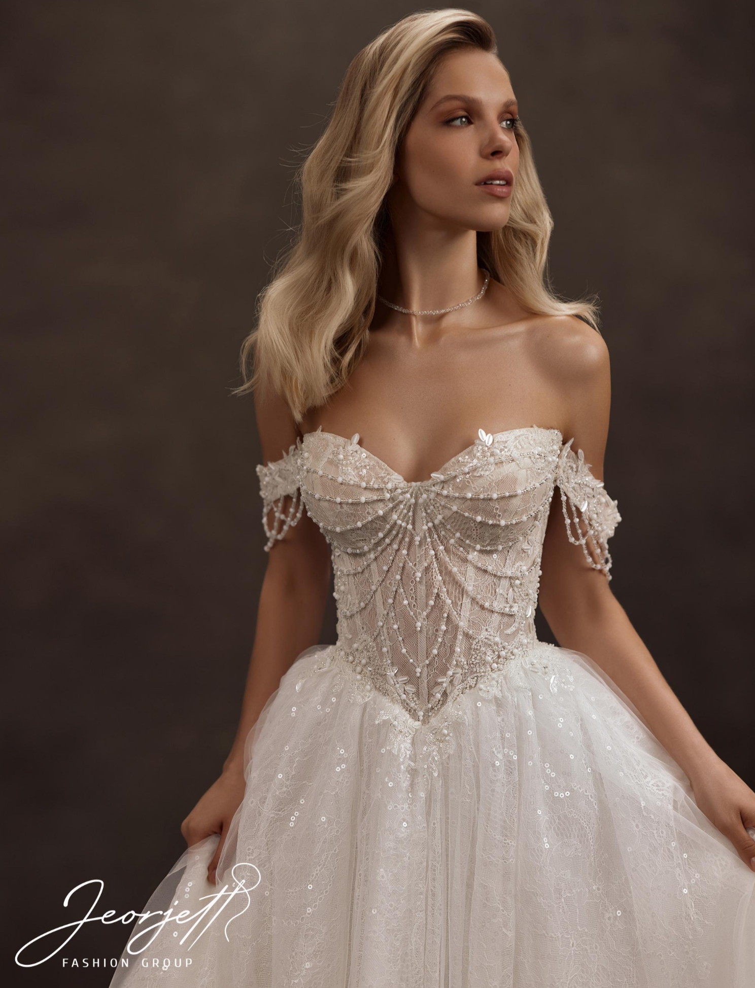 Son corset richement travaillé apporte une structure élégante et met en valeur la silhouette avec raffinement. Les détails délicats et les perles apportent une touche haute couture à cette robe.