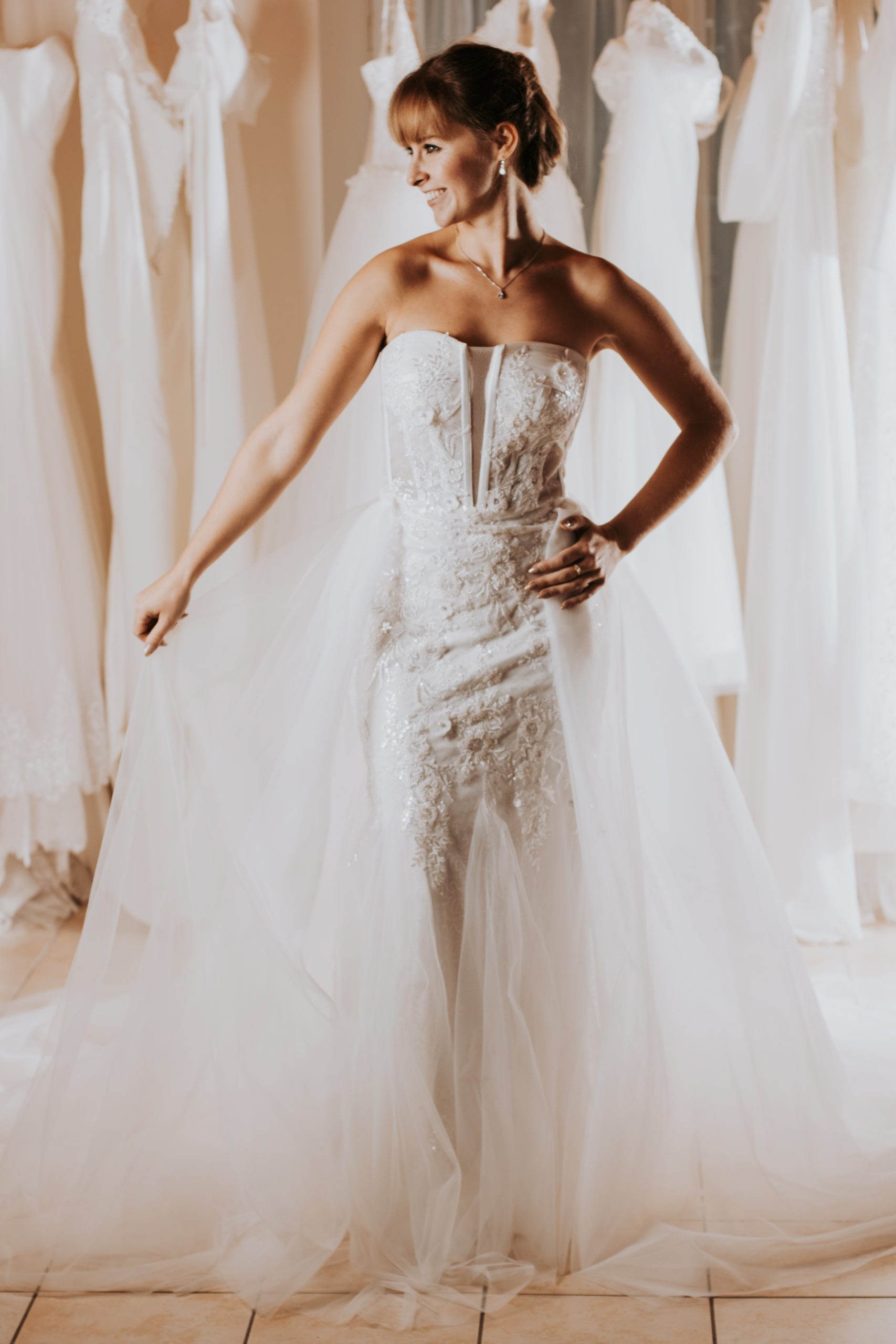 La jupe amovible en tulle vient transformer la robe en une véritable robe princesse, apportant du volume et un effet “waouh” immédiat. Cette transformation est idéale pour l’entrée ou l’ouverture de bal.