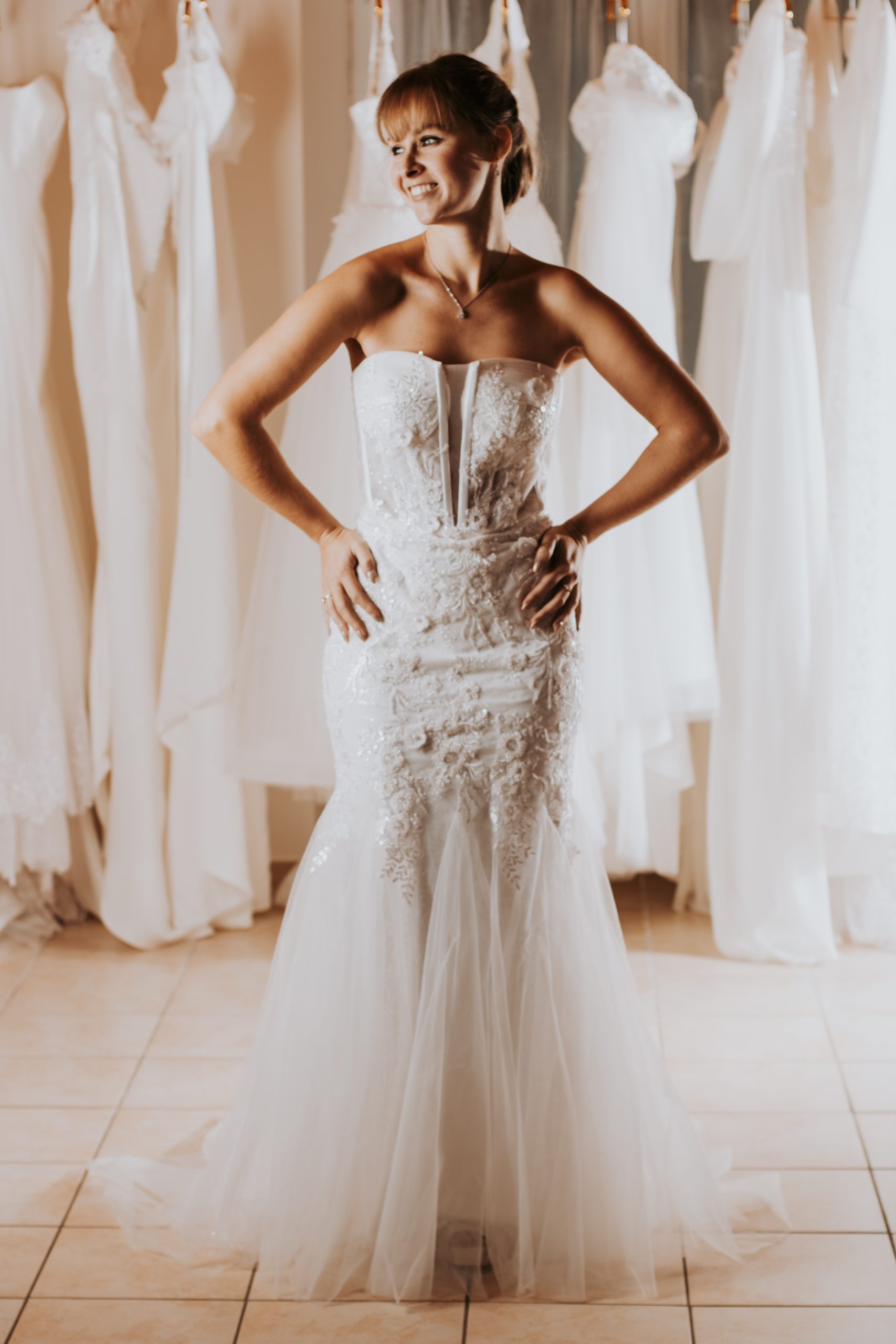 Le bustier structuré en dentelle met en valeur le buste avec finesse, tandis que la coupe sirène épouse les formes pour un rendu glamour et féminin. Cette première version est parfaite pour la cérémonie ou les photos.