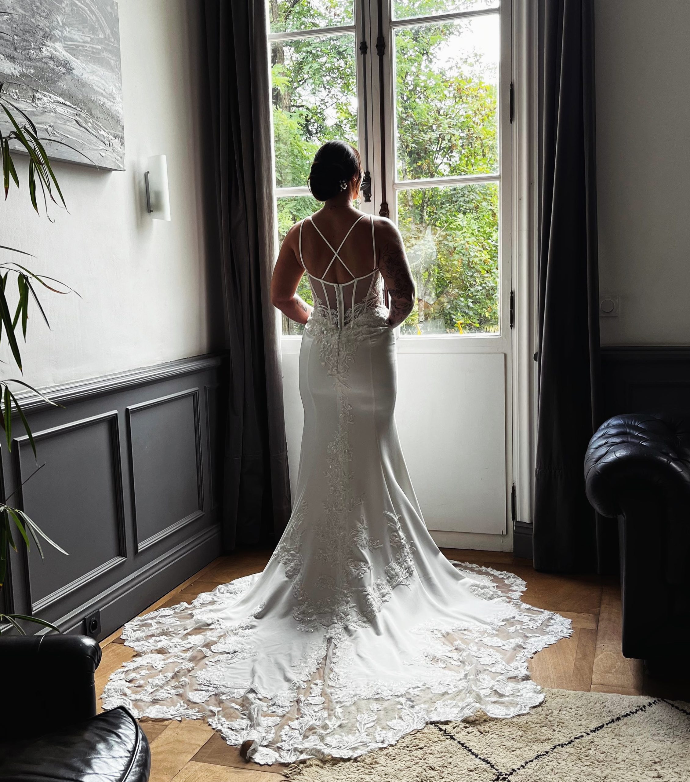 Sa coupe près du corps et sa traîne en dentelle offrent un rendu exceptionnel en photo.