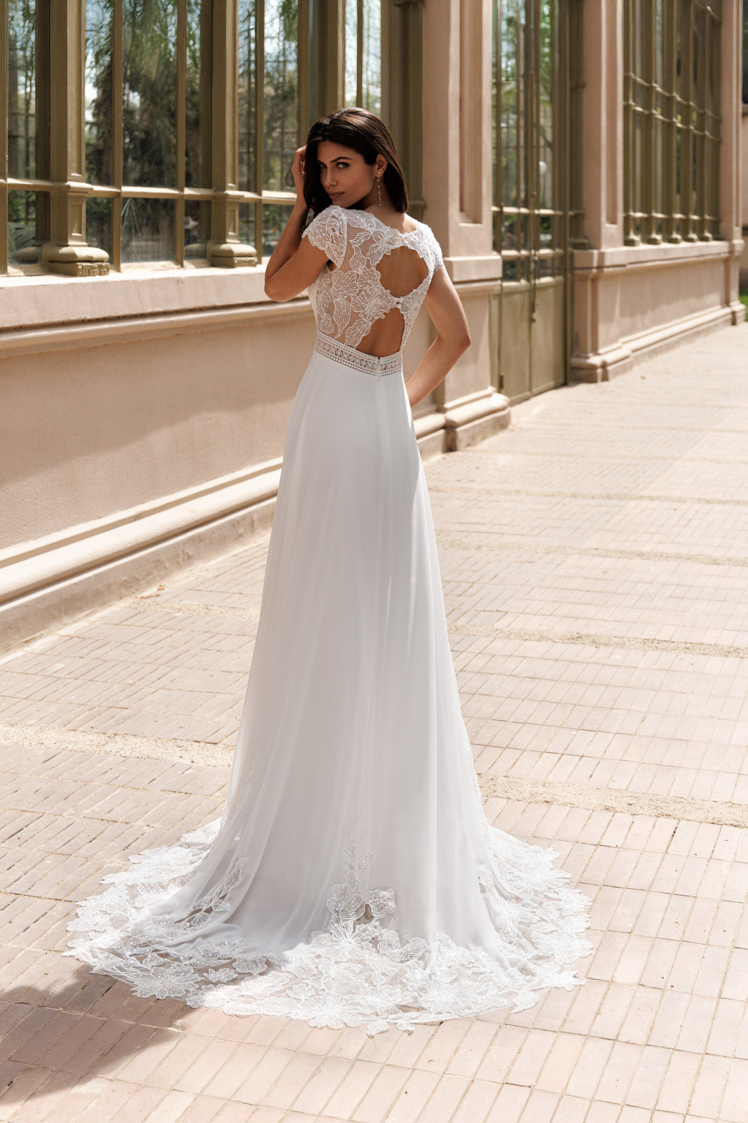 Le dos ouvert en dentelle est l’un des éléments les plus remarquables de cette robe. Les motifs floraux créent un effet romantique et raffiné.