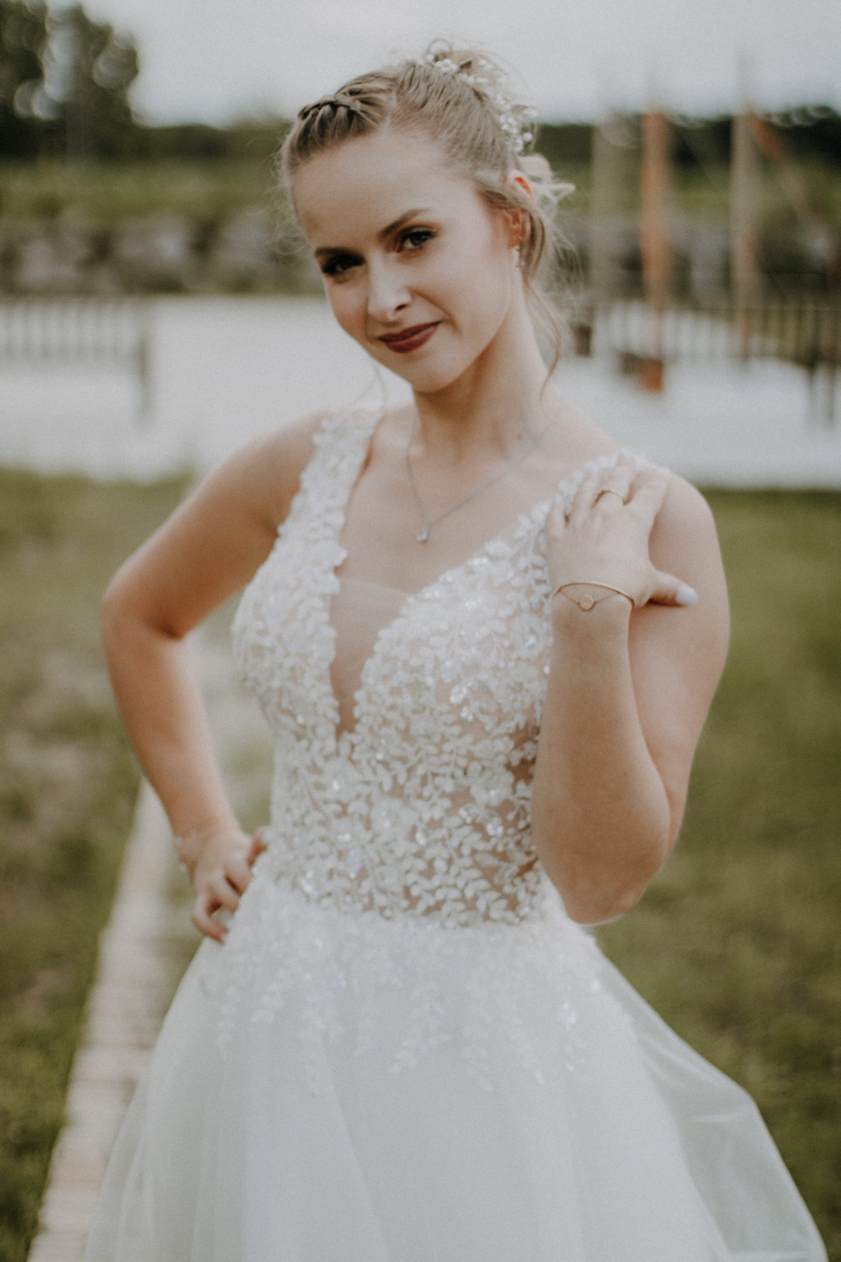 La jupe fluide s’évase naturellement à partir de la taille, créant un mouvement léger et aérien. Cette coupe permet à la mariée de se sentir libre et à l’aise tout au long de la journée.
